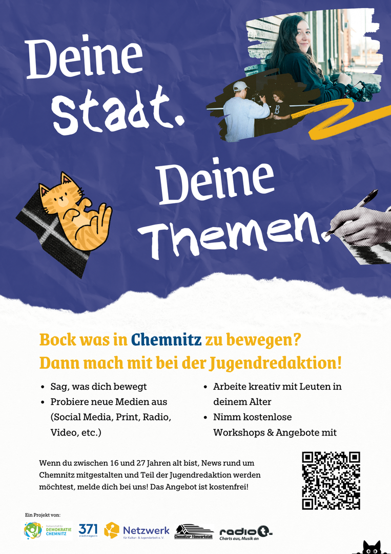 Im Rahmen der Partnerschaft für Demokratie Chemnitz entstand 2025 ein spannendes neues Projekt: eine multimedial arbeitende Jugendredaktion, in der junge Menschen zwischen 16 und 27 Jahren journalistisch aktiv werden können. Sie machen sich dabei selbst ein Bild von der Stadt, ihren Themen und aktuellen News rund um Chemnitz und berichten anschließend darüber. Im Mittelpunkt stehen Themen wie Demokratie, Jugendbeteiligung und zivilgesellschaftliches Engagement. Die Beiträge dafür werden auf Social Media und im Chemnitzer Stadtmagazin 371 erscheinen.
