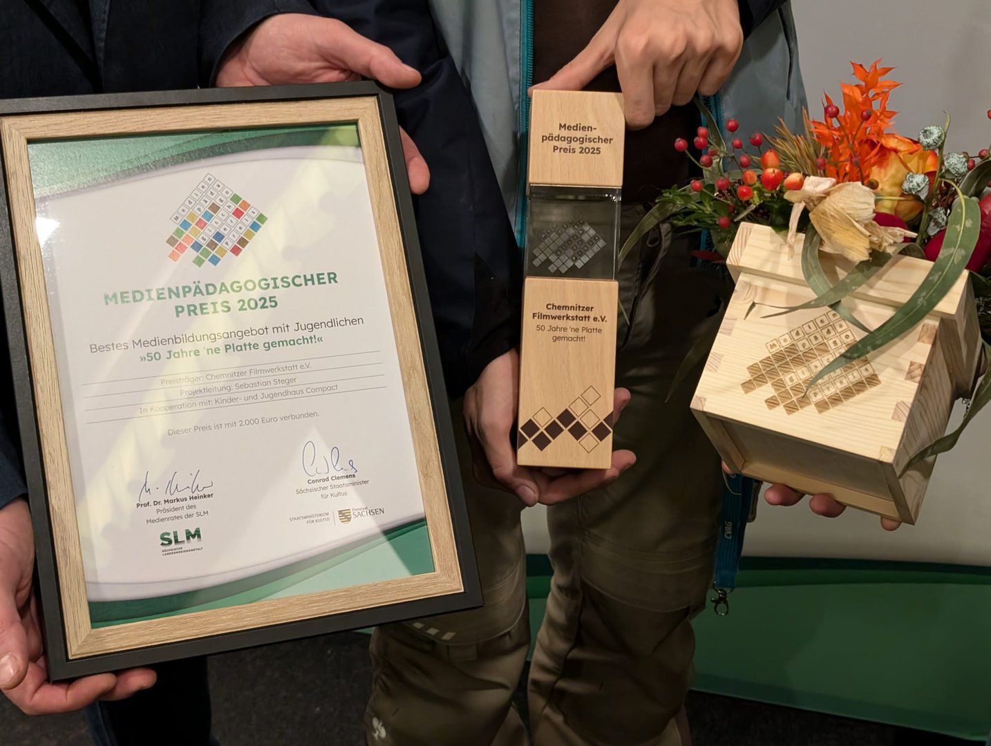 Der Medienpädagogische Preis der Sächsischen Landesmedienanstalt geht nach Chemnitz! Unser Film "50 Jahre 'ne Platte gemacht" wurde am 30.10.2025 in der Kategorie "Bestes Medienkompetenzprojekt mit Jugendlichen" geehrt. Die Preisverleihung findet jährlich in der "Schauburg" Dresden statt.